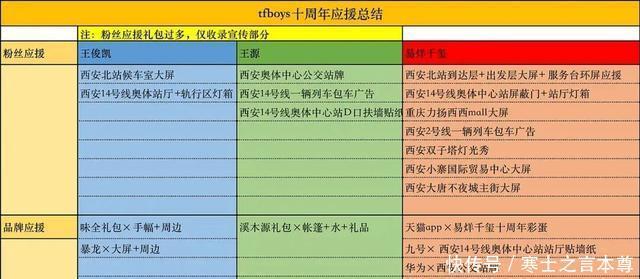 TFBOYS粉丝应援总结表格 2017年9月,经纪公司时代峰峻为王俊凯、易烊千玺、王源分别成立个人工作室,正式开启三人“单飞不解散”的工作模式。 自此三人迎来不同的命运轨迹,组合队长王俊凯是最早接触影视表演的一位,也上各大综艺、出专辑,多方位发展。 但并不算顺遂,从《解忧杂货店》《断·桥》到《万里归途》《749局》,王俊凯的演技遭人诟病。